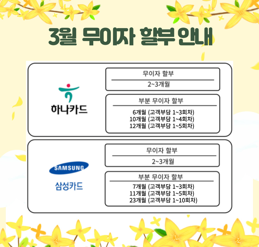 삼성카드를 제외한 나머지 모든 카드는 현재 일시불 결제만 가능하도록 변경되었습니다. ( 현대카드 결제 불가 )
