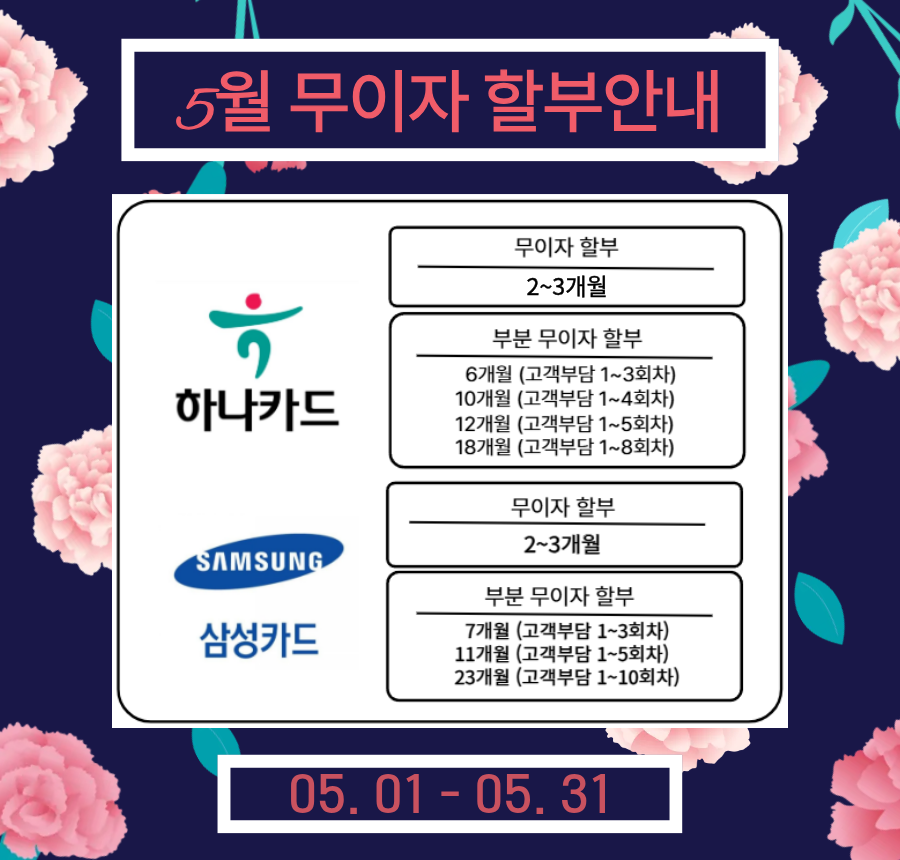 삼성카드를 제외한 나머지 모든 카드는 현재 일시불 결제만 가능하도록 변경되었습니다. ( 현대카드 결제 불가 )