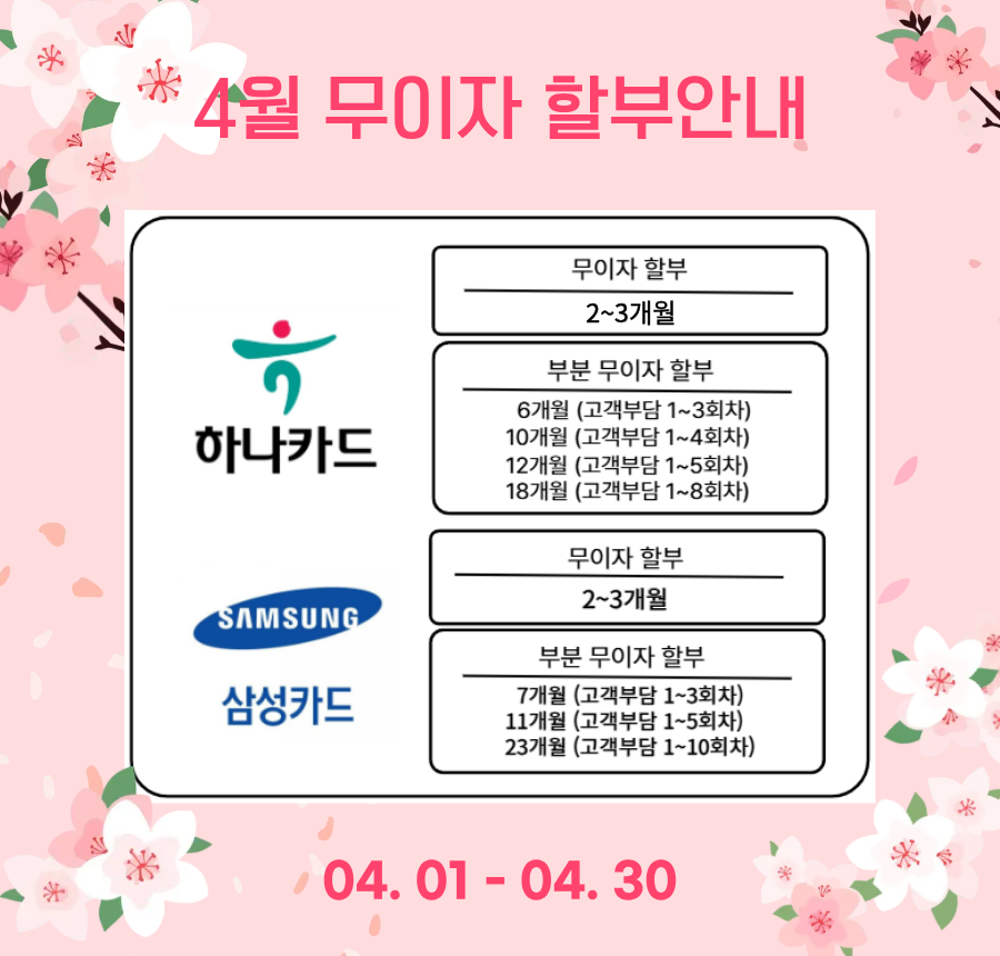 삼성카드를 제외한 나머지 모든 카드는 현재 일시불 결제만 가능하도록 변경되었습니다. ( 현대카드 결제 불가 )