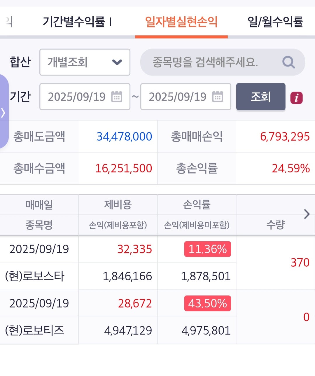 아이껀 첫 50%보단 낮게 40% 가 목표수익율이였고 전날 38%를 찍고 내려가 약올리기에 오전에 목표수익률에 매도 걸고 매도 완료... 아~ 주가가 고점 28%까지 찍고 내려갔네요. (제가 매도하는 날은 늘 로보티즈가 폭등하네요 아까비~ㅋ)