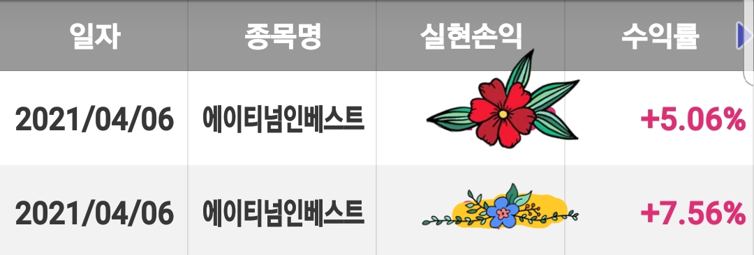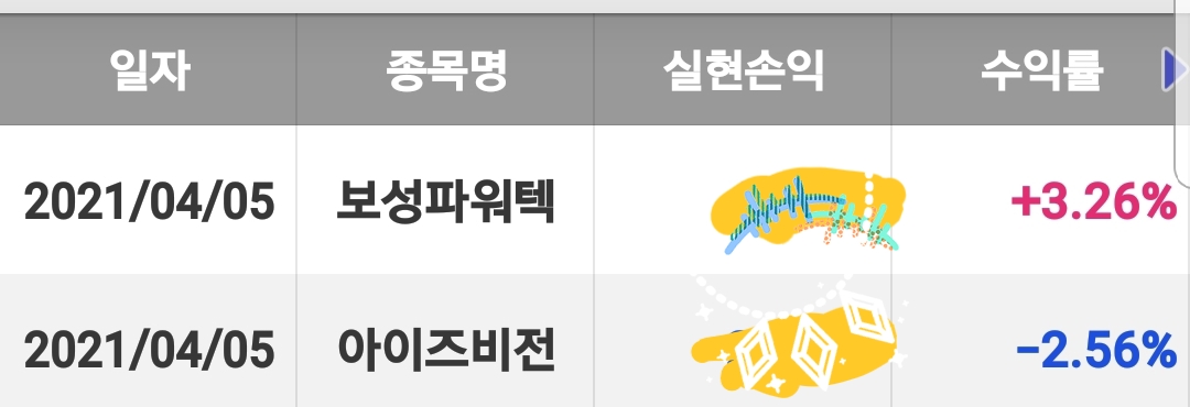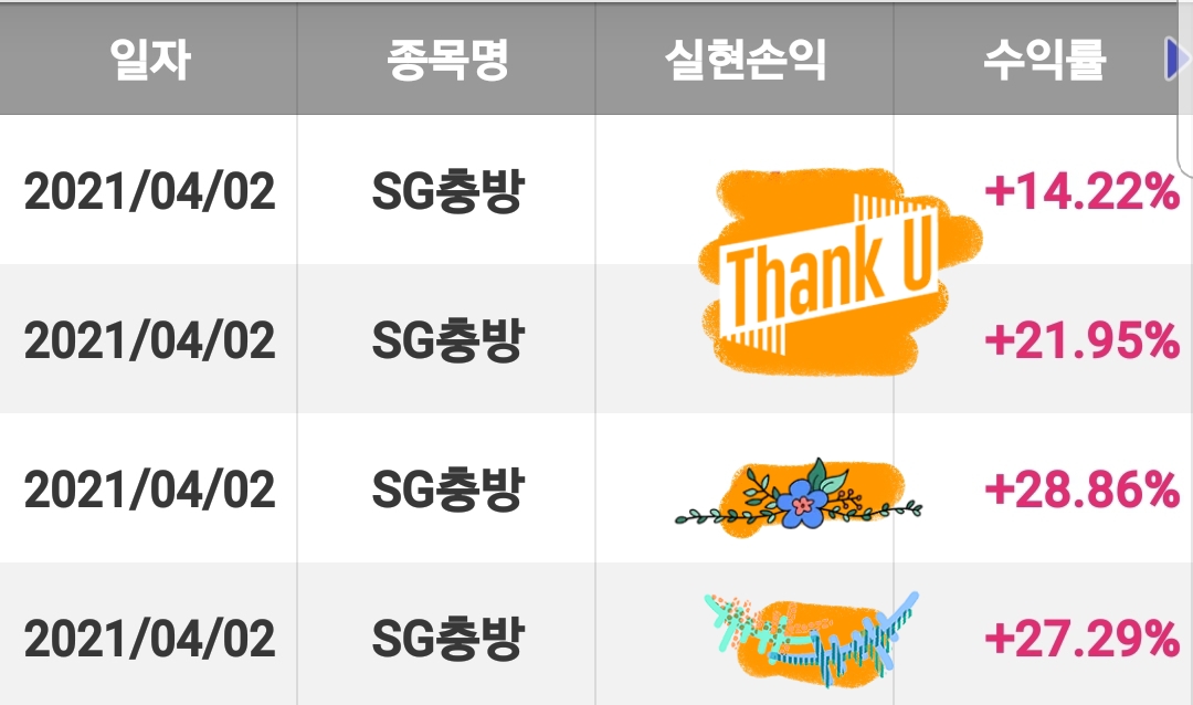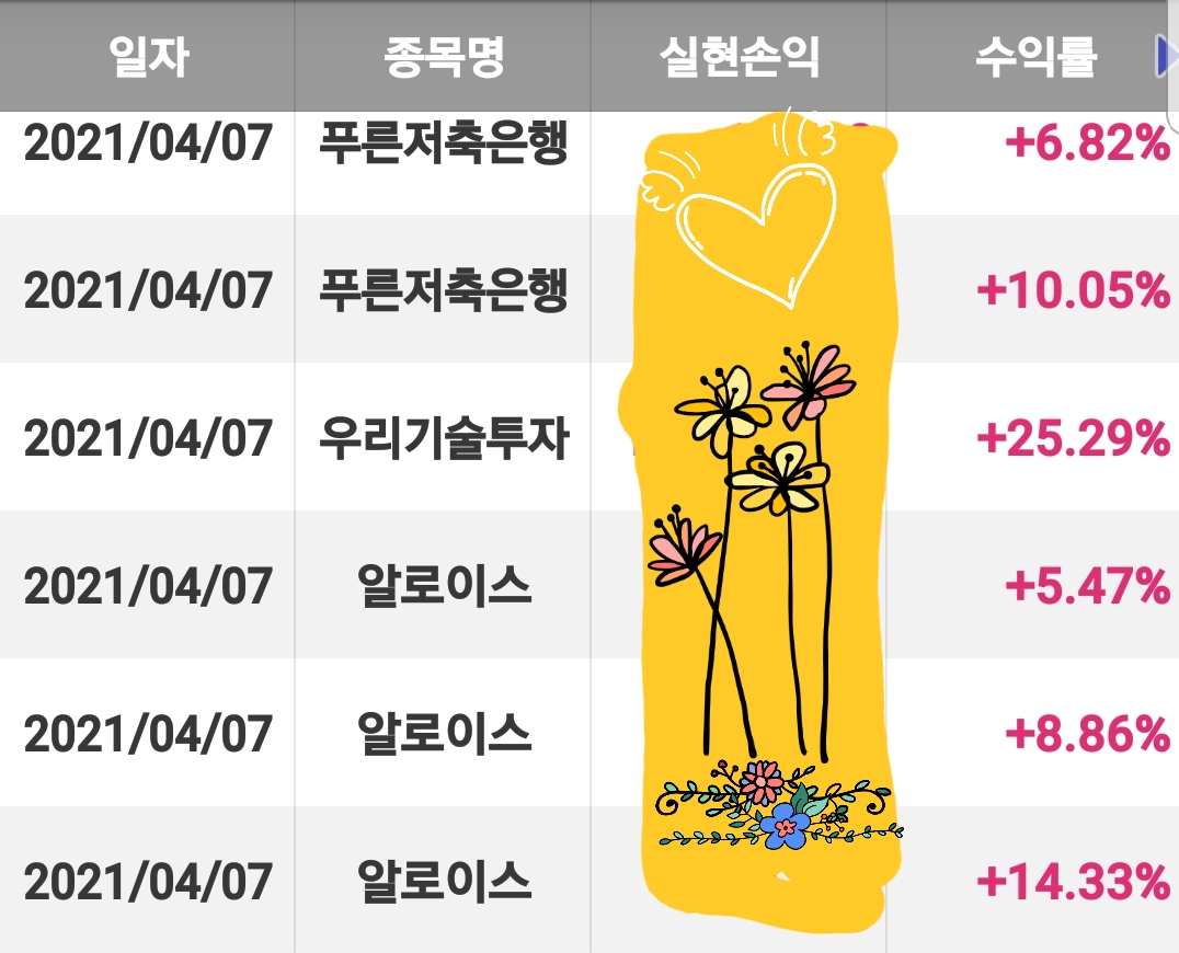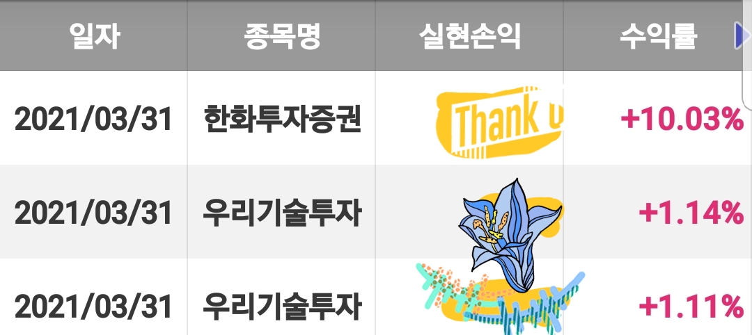 일부 거래내역으로 증명합니다. 원칙을 체크 못하고 들어간 종목은 마이너스로 나왔는데 몇 몇 종목은 그래도 수익으로 나온 종목도 있었습니다.