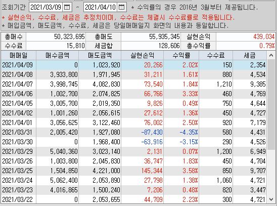 며칠 전에 강의 후기 올렸지만 말이 뭐가 필요하겠습니까? 계좌로 말하겠습니다. 전 다른 분들의 비해 상당히 보수적으로 접근하였고(조금이라도 찝찝한 종목은 다 제외) 하루에 1~2종목 매매하는 것이 끝입니다. 또한 1종목 당 100만원을 무조건 지켰습니다.(3월 강의 시작 때 총 예수금은 275만원이었고 추가 입금 안했습니다) 그 결과 강의기간동안에만 벌써 강의비에 50%는 벌었네요. 제가 이정도 벌었으니 조금 자유롭게 매매하시는 분들은 종목당 100만원씩만 했어도 이미 강의비의 2배는 수익을 얻으셨을 것입니다. 종산 2기 그때는 돌파 강의도 해주시면 좋겠습니다. 그때까지 월 천! 꼭 해보겠습니다. 감사합니다! 종산 쓰앵님!