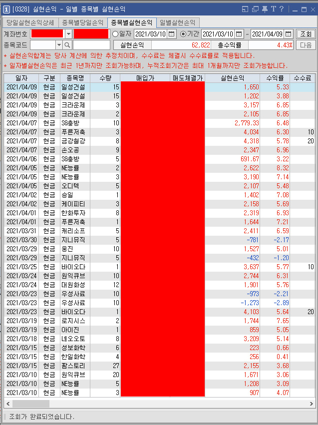 현재 저는 계좌에 돈을 넣을 형편은 되지는 않습니다만. 적은 액수로 하시는 분들 다른 계좌 예수금 쳐다보지 마시고 천천히 하시라는 의미로 저의 반찬값 매매 내역 올려봅니다.